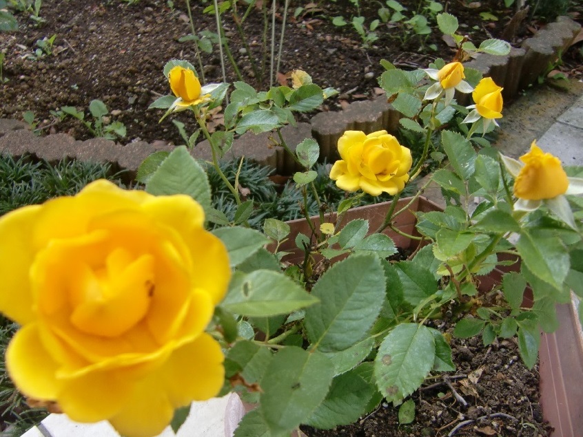 品 種 名 → モーティマー・サックラー 花 期 : 5月中旬〜10月上旬 (四季咲き) コメント : トゲが少なくしなやかな枝芯がしっかりしている自立するタイプのバラです。 【中】 品 種 名 → フリージア 花 期 : 5月中旬〜10月上旬 (四季咲き) コメント : 早咲きで大きな花びらの黄色い花色は褪せにくく、まぶしい感じの黄色です。 【右】 品 種 名 → ソニア 花 期 : 5月中旬〜10月上旬 (四季咲き) コメント : 花形はロゼット咲きで、ぎっしり詰まった花びらが規則正しく並んだ状態で開く感じ。 |