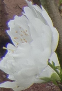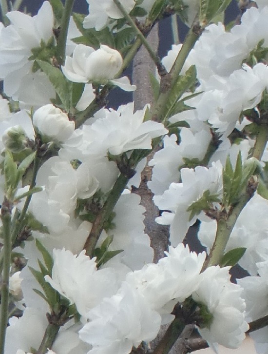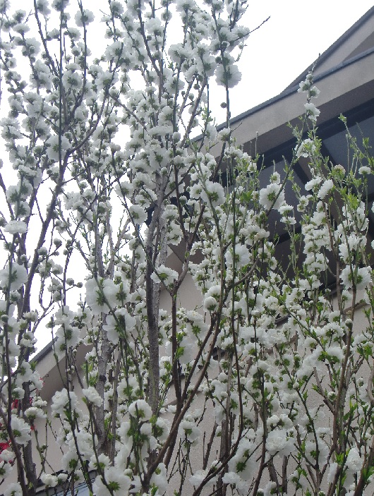 品 種 名 → 照手桃(白) 花 期 : 3月下旬〜4月上旬 コメント : 狭い場所にも植えられる花桃です。花は大輪の八重咲きで、枝立ちも良く横に広がらず、 細く上に伸びていきます。 |